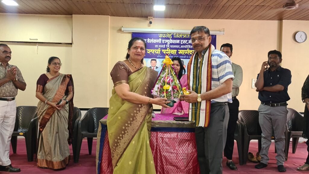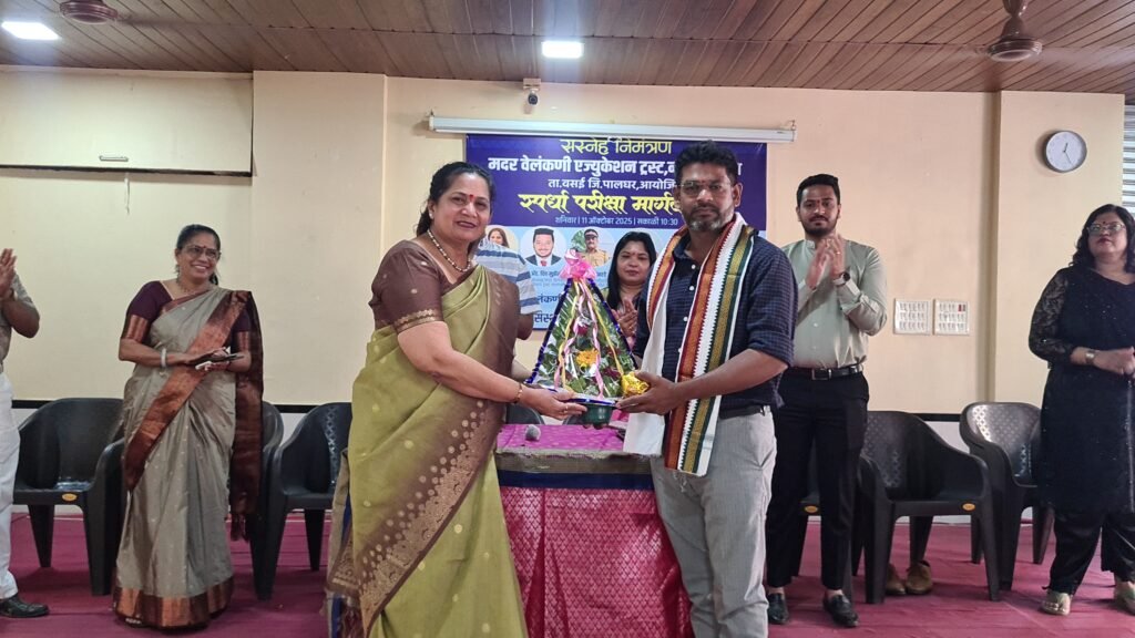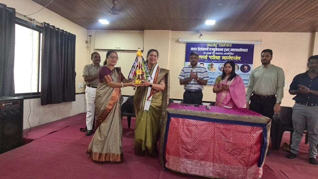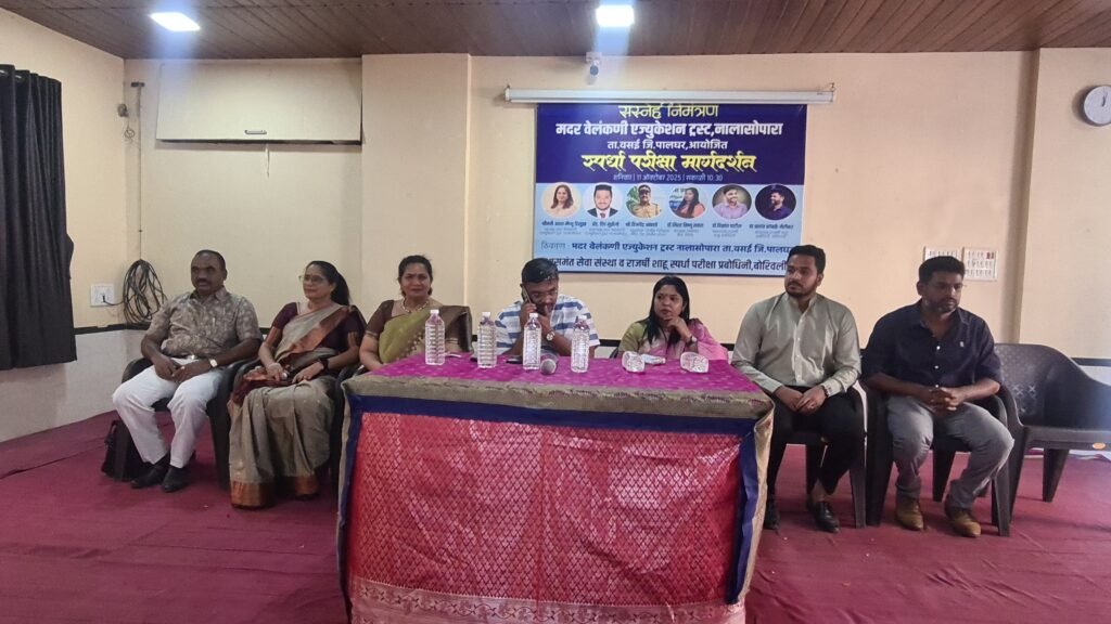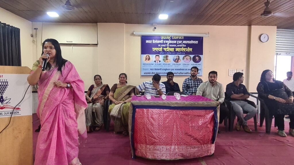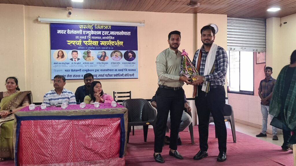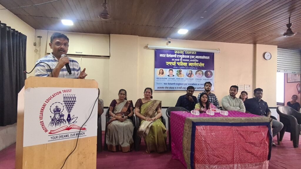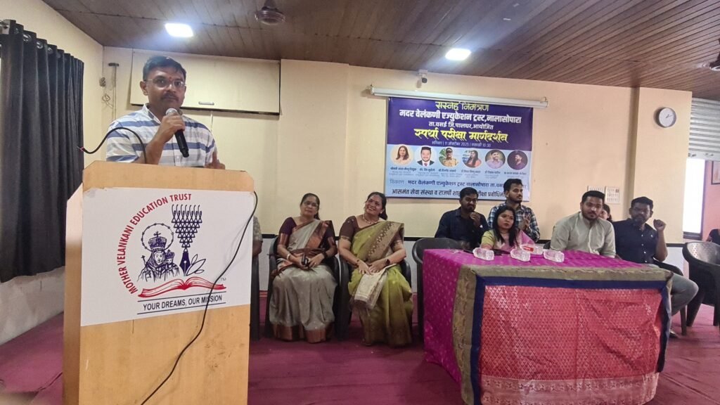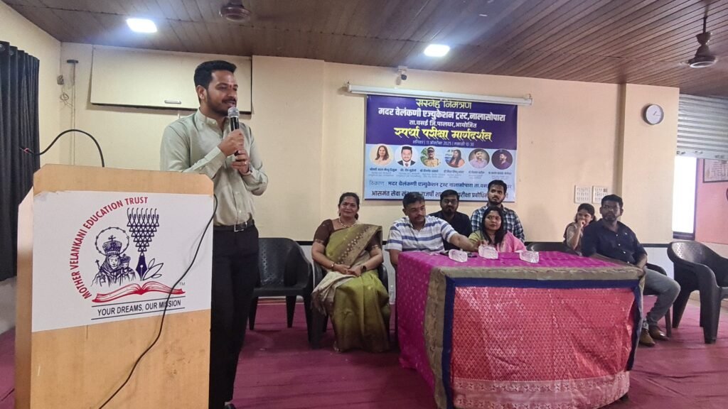 The Mother Velankanni Education Trust, Nalasopara, organized a Competitive Exam Guidance Program on Saturday, 11th October 2025, at 10:30 AM at its campus in Taluka Vasai, District Palghar. The event was aimed at guiding and inspiring students from classes 10, 11, and 12 to prepare for competitive examinations like MPSC and to motivate them toward building a brighter future through public service. The program was chaired by Smt. Asha Mathew D’Souza, President of the Trust. Among the dignitaries present were Dr. Nisha Vishnu Savara, President of Aasaman Seva Sanstha, Mr. Baban Kamble and key mentors Dr. Vikrant Patil, Founder of Rajarshi Shahu Prabodhini, and Prof. Prashant Kamble-Nerlekar, Director of Rajarshi Shahu Prabodhini, Borivali. The special guest for the event was Adv. Deep Munzello, Vice President of the Mother Velankanni Education Trust.